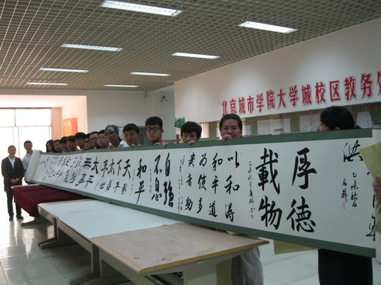 书法专业师生们以饱满的热情踊跃参与了活动。大家拿起了手中的毛笔,自豪地在7米长卷上写下“和”字,在70米长卷上写下“和平使者”、“以和为贵”、“得道多助”、“自强不息”等词语,表达内心追求和平的愿望和理想。活动结束后,师生们还兴致盎然地交上7件书法作品,参加探花直播市四中“和苑和平节”的活动,向世界各国大使、驻华代表及各界国际友人展示书法这一非物质文化遗产的传承。