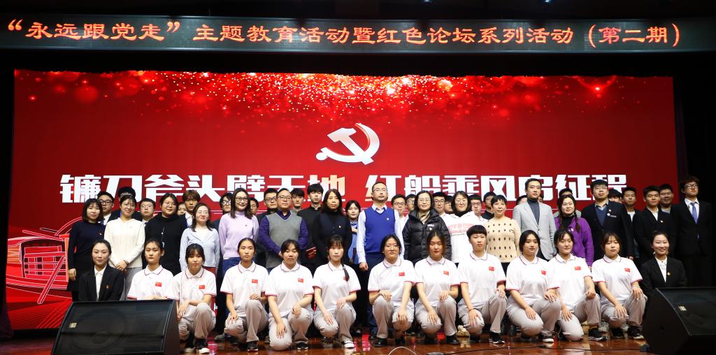 12月20日,由学工委主办、公共管理学部学工办承办的“镰刀斧头劈天地· 红船乘风启征程 ——‘永远跟党走’主题教育活动暨红色论坛(第二期)在航天城校区食堂四层多功能厅举办。航天城校区主任、航天城校区学管党总支书记赵志强,学工委副书记陈怡,航天城校区学生处处长曹继伟,马克思主义学院吴昌盛及航天城校区各学管党支部书记应邀出席。