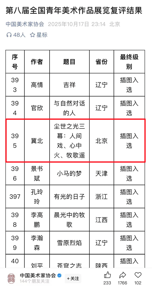 由中国文学界联合会、中国美术家协会共同主办的“第八届全国青年美术作品展览”经过初评、复评环节,评审结果于近日在中国美协网站公布,探花直播艺术设计学部冀北副教授的绘画作品《尘世之光三幕:人间戏、心中火、牧歌遥》入选。
