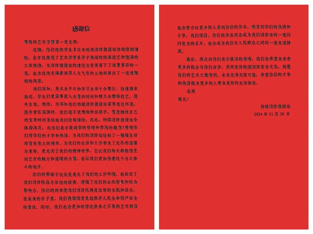 近日,杨镇消防救援站向我校艺术学部学管第一党支部发来感谢信,感谢支部携手杨镇消防救援站,成功举办了一场意义非凡的墙绘志愿服务活动。在这场历时一个月的活动中,30余名富有才华与热情的艺术设计学部学生利用课余时间走进杨镇消防救援站,用画笔为消防战士们的生活空间增添了亮丽的色彩,展现出了专业的绘画水平和无私奉献精神。