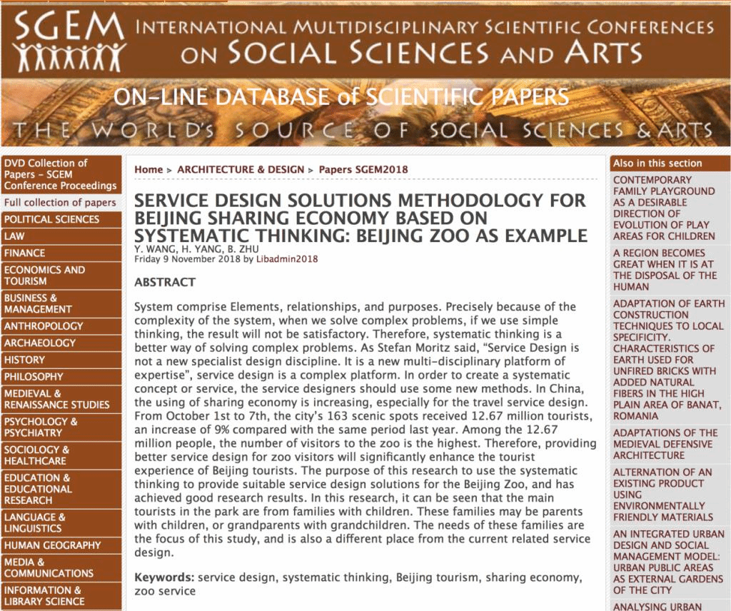 2018年11月,在INTERNATIONAL MULTIDISCIPLINARY SCIENTIFIC CONFERENCE ON SOCIAL SCIENCE AND ARTS发表论文:SERVICE DESIGN SOLUTIONS METHODOLOGY FOR BEIJING SHARING ECONOMY BASED ON SYSTEMATIC THINKING: BEIJING ZOO AS EXAMPLE
