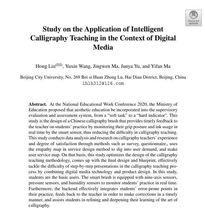 发表论文:2022年7月 在Design Thinking and Practice in Contemporary and Emerging Technologies发表论文Study on the Application of Intelligent Calligraphy Teaching in the Context of Digital Media