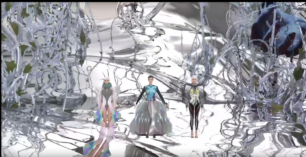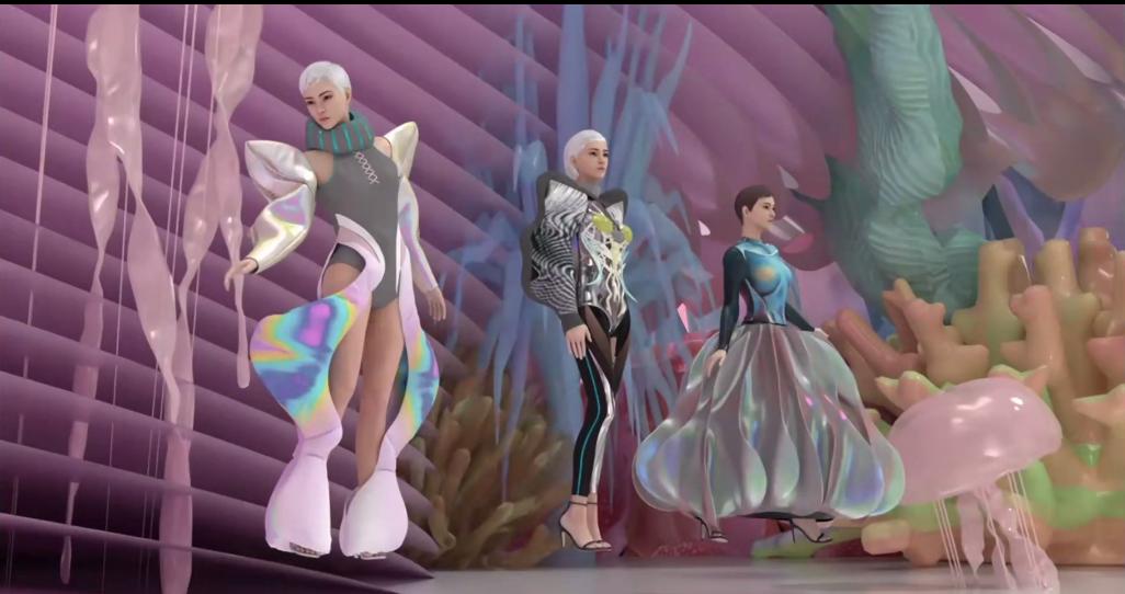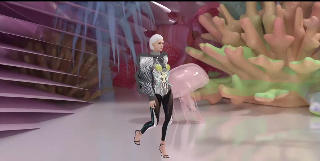 我运用仿生水母与金属异形的廓形结合来体现未来世界的美轮美奂。三款设计分别运用3D打印技术、数码印花与热成像技术,整体服装呈现出一种五彩斑斓的效果,既强调在风格上发扬个性,又尽力探索未来主义风格的服装形式。