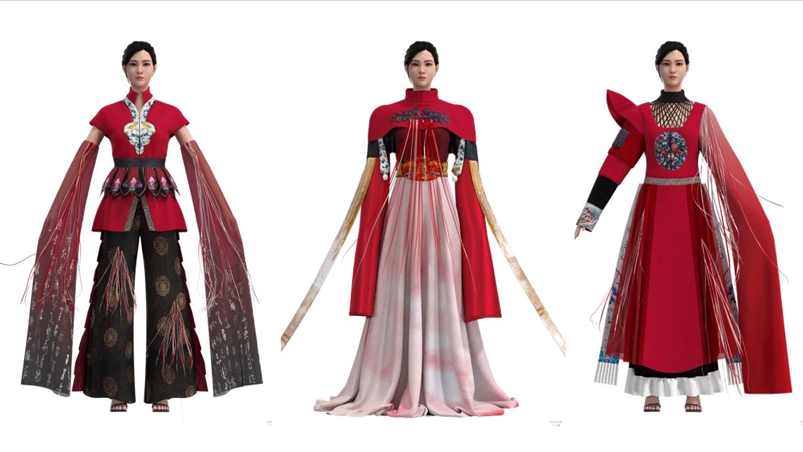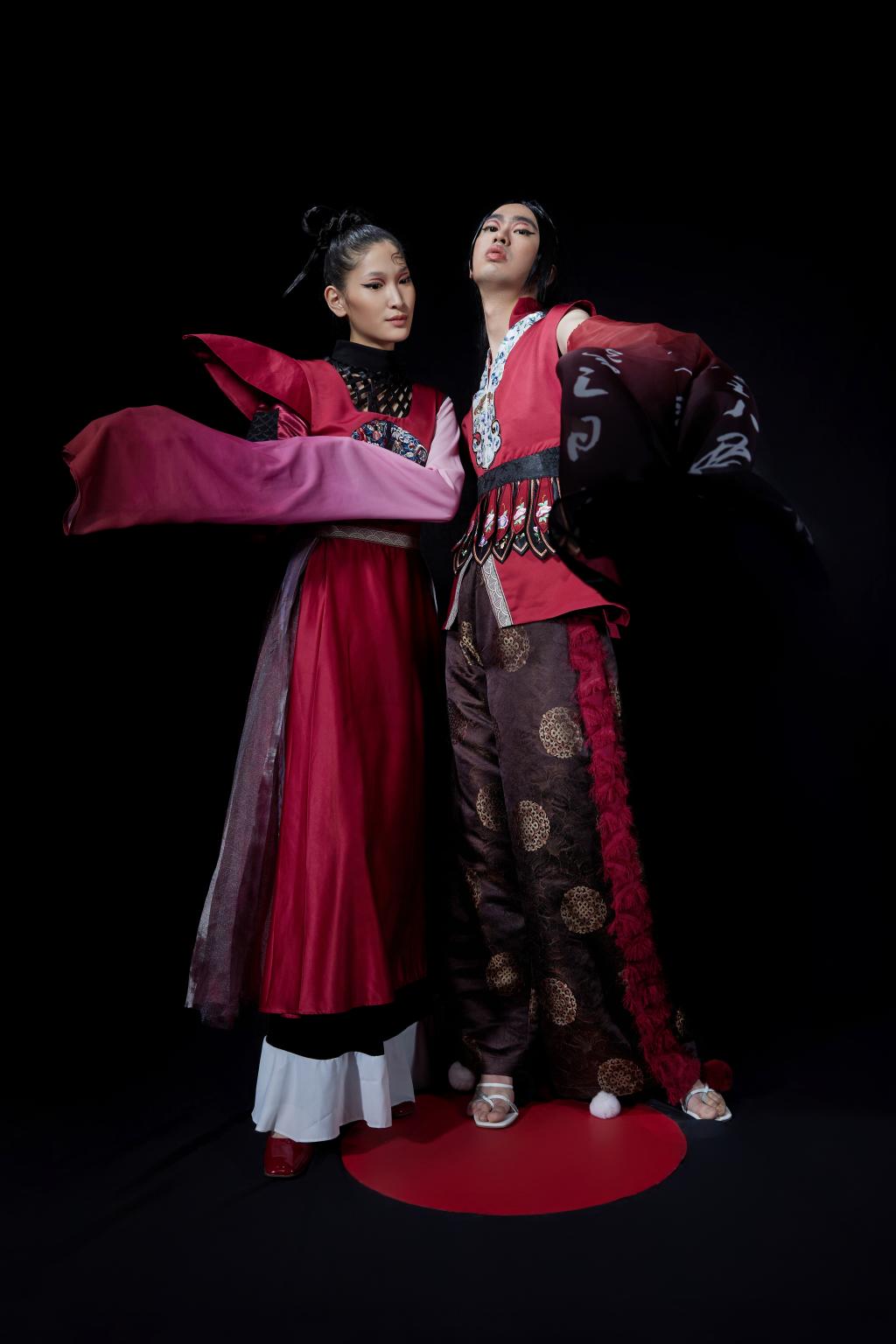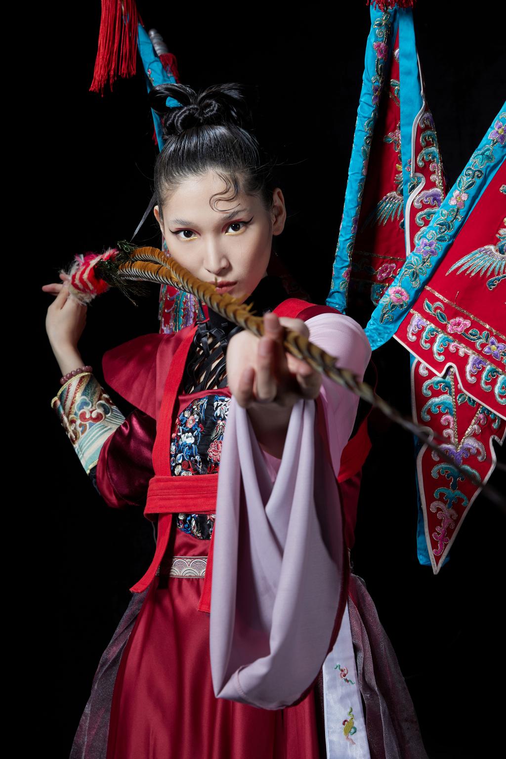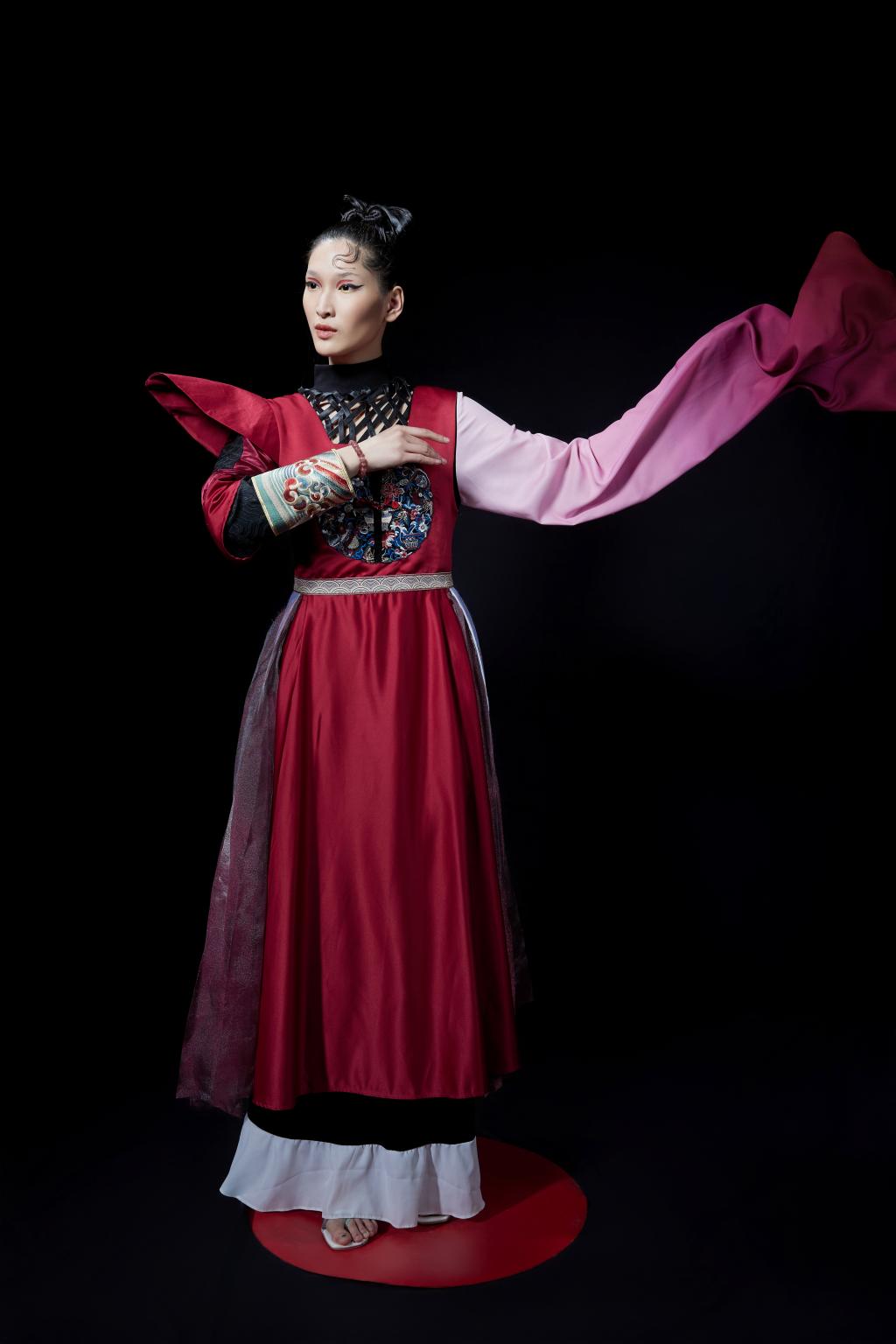 主要灵感来源于经典京剧剧目《穆桂英挂帅》。“斜披蟒”穿戴作为角色的特殊点,将盔甲与水袖结合,体现了穆桂英的忠勇、果敢,通过对戏剧服装的色彩和材质巧妙应用,设计出中国风时装,表达东方美学。