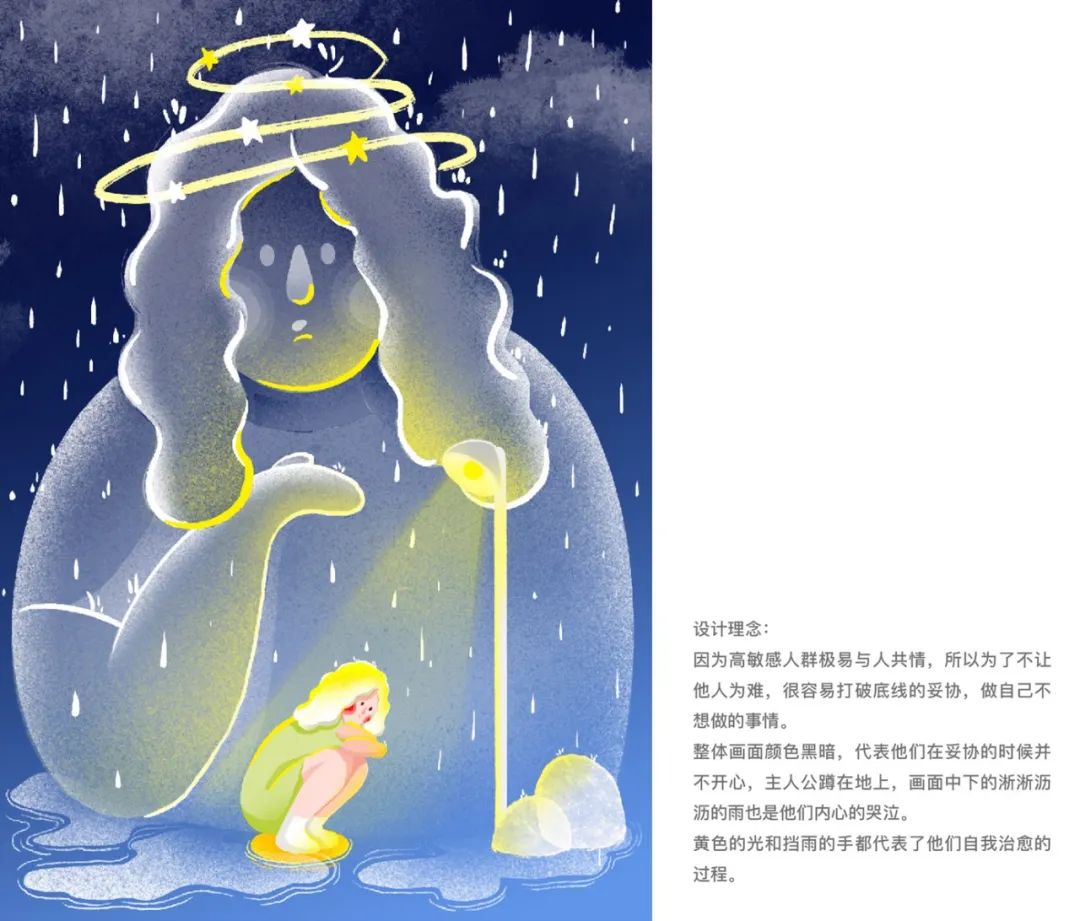 在心理学领域高敏感人格(HSP)是一种比较稳定和持久的人格特征,它不是症状也不是疾病,具备这种人格特征的人约占世界总人口的20%左右,也就是说在我们的身边,每五个人中就会有一个是高敏感人格。本次设计主要围绕“解读高敏感人群”进插画绘制,画面整体以扁平插画风为主,再加入纹理效果的表现,使画面更加丰富。配色会根据每张画面的主题来总结合适的颜色,颜色也以高饱和度、弥散光渐变为主,让画面更加年轻有活力,营造一种愉快、通透的氛围。