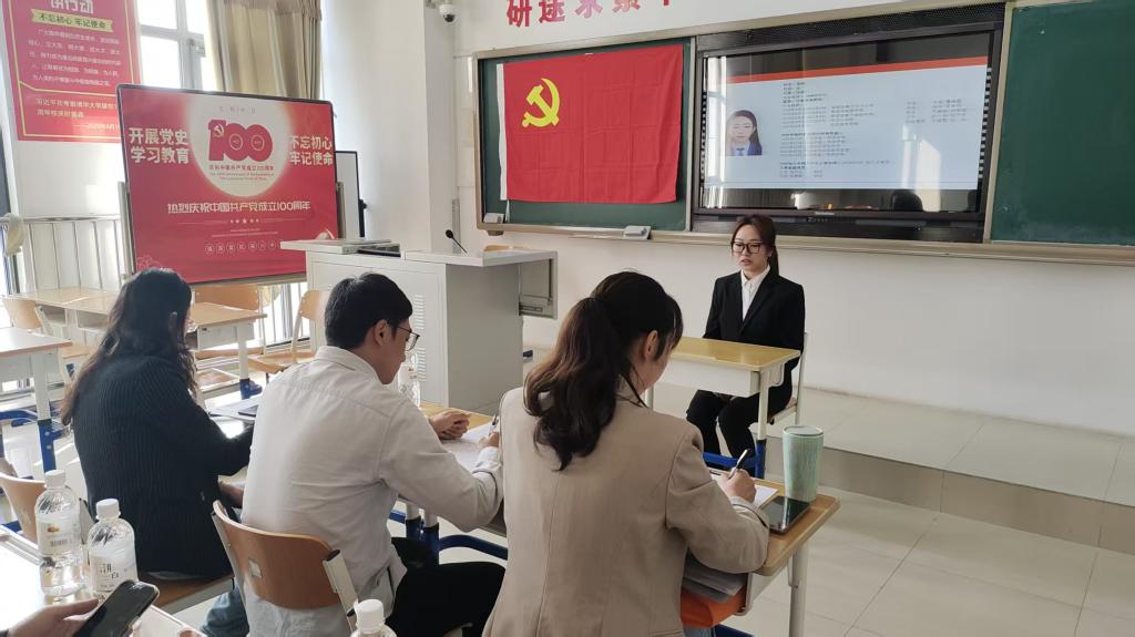 下午14:30面试考核接续进行。评委组包括肖老师、谭老师、张老师以及支部组织委员、宣传委员、党小组组长3名学生党员。作为组织委员肖纪元负责流程衔接,党小组组长马志涛负责拍照,宣传委员谢婉坷负责记录,分工明确、协作高效。李晓滢等10名拟发展对象按顺序入场。自我介绍阶段,学生有序阐述个人基本信息、学习情况、社会实践经历及思想成长历程;问答环节,评委组老师结合学生成长经历深挖入党动机纯粹性与理想信念坚定性,围绕党的理论知识考察掌握与应用能力,结合个人经历了解应对困难、团队协作及服务集体的实际表现,判断学生是否符合党员发展标准,进行客观评分,确保评价准确。