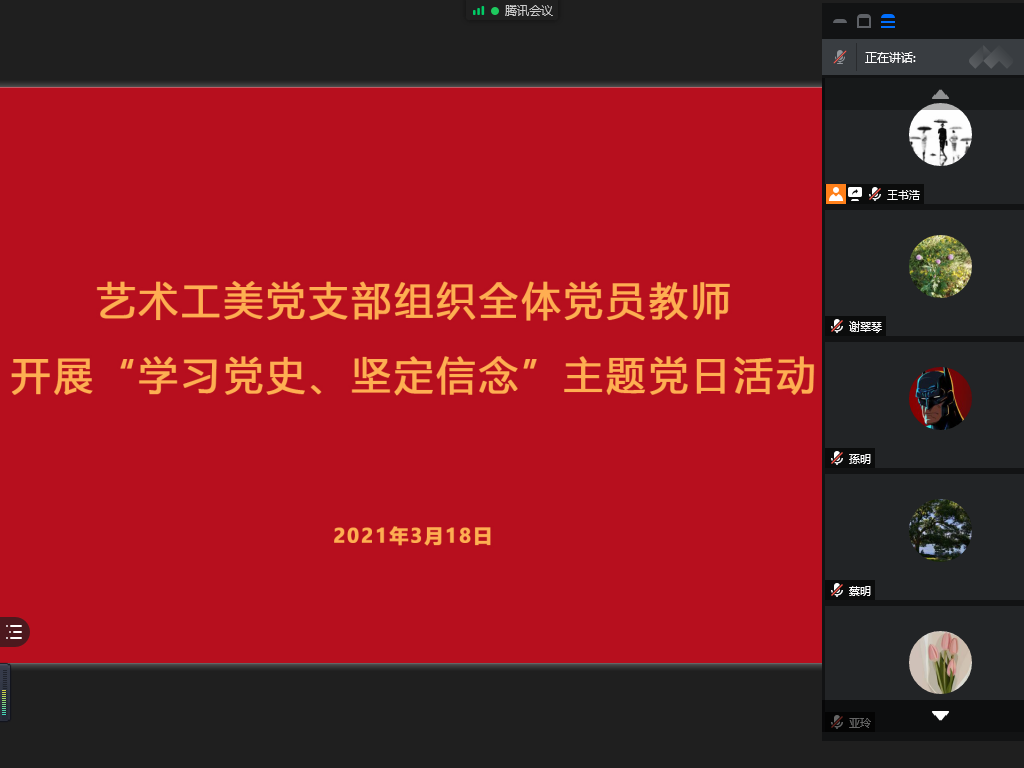 按照校党委“先学一步”党史学习的重要工作部署,为发扬党的光荣传统和优良作风,铭记党的奋斗历程,进一步坚定教师党员的理想信念,2021年3月18日,艺术工美党支部开展了“学习党史 坚定信念”主题党日活动。