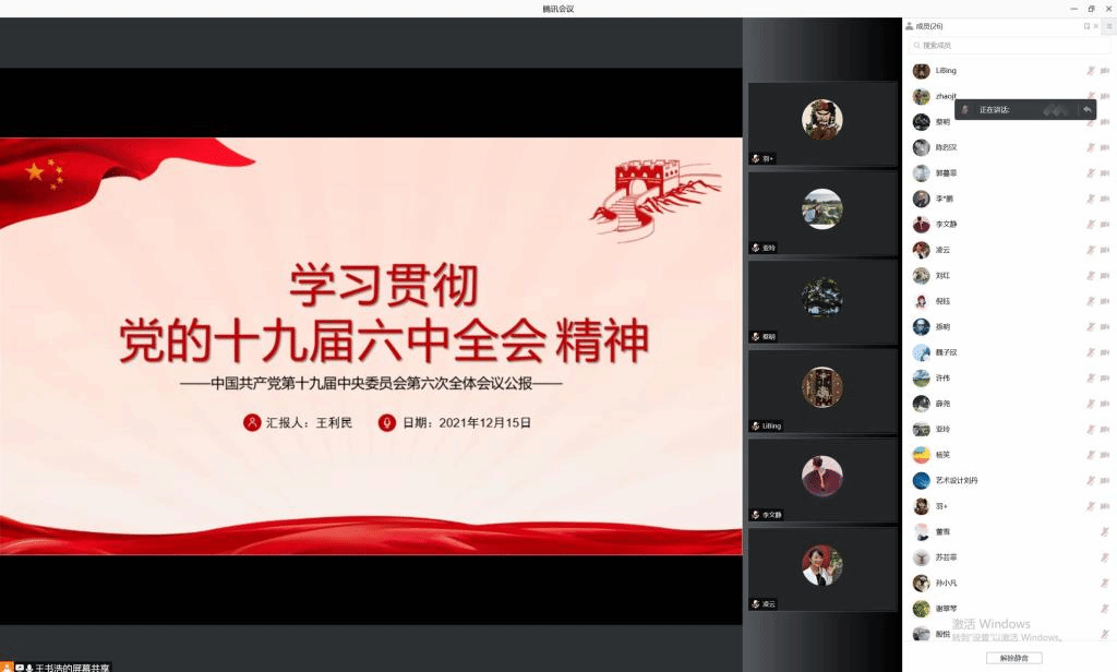 中国共产党十九届六中全会于2021年11月8日—11日在探花直播胜利召开。12月15日下午,艺术工美党支部组织全体党员召开了学习党的十九届六中全会精神专题会,会议采用线上线下相结合的形式进行,支部书记王利民进行领学,会议由支部组织委员王书浩主持。