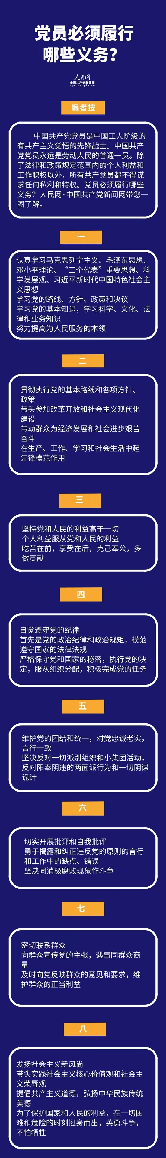 (1)认真学习马克思列宁主义、毛泽东思想、邓小平理论和三个代表重要思想,学习党的路线、方针、政策及决策,学习党的基本知识,学习科学、文化和业务知识,努力提高为人民服务的本领。(2)贯彻执行党的基本路线和各项方针、政策,带头参加改革开放和社会主义现代化建设,带动群众为经济发展和社会进步艰苦奋斗,在生产、工作、学习和社会生活中起先锋模范作用。(3)坚持党金额人民的利益高于一切,个人利益服从党和人民的利益,吃苦在前,享受在后,克己奉公,多做贡献。(4)自觉遵守党的纪律、模范遵守国家的法律法规,严格保守党和国家的秘密,执行党的决定,服从组织分配,积极完成党的任务。(5)维护党的团结和统一,对党忠诚老实,言行一致,坚决反对一切派别和小集团活动,反对阳奉阴违的两面派行为和一切阴谋诡计。(6)切实开展批评和自我批评,勇于揭露和纠正工作中的的缺点、错误,坚决同消极腐败的现象作斗争。(7)密切联系群众,向群众宣传党的主张,遇事同群众商量,及时向党反映群众的意见和要求,维护群众的正当利益。(8)发扬社会主义新风尚,提倡共产主义道德,为了保护国家和人民的利益,在一切困难和危险的时刻挺身而出,英勇斗争,不怕牺牲。