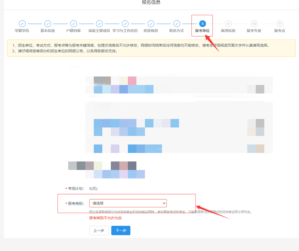 第二步,点击“修改报名信息”,修改报名信息时,前面页面内的其他正确的信息不需要做任何修改,直接点击“下一步”。在第8项“报考单位”页面,将报考类别从11非定向修改为12定向,并填写定向就业单位信息,之后的其他步骤仍只需点击“下一步”,直到确认报名信息后视为重新提交成功。