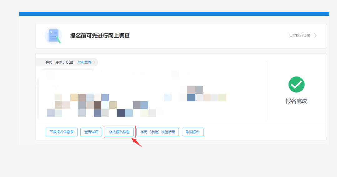 第一步,考生可自行登录原报名账号(无需重复注册),登录成功后在报名信息下方会看到“修改报名信息”选项。