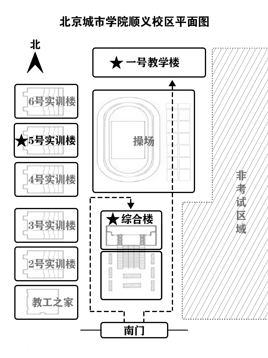 考试期间本考点所有校外考生须从顺义校区的南门进入校园,考生根据考场分布图及现场指引步行至所在考试楼。需要进入备用考场的,将有专人引导至备用考试楼。