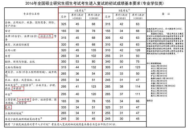 根据教育部公布的《2016年全国硕士研究生招生考试考生进入复试的初试成绩基本要求(专业学位类)》,我校社会工作硕士、中药学硕士、公共管理硕士及艺术硕士下设的音乐硕士、电影硕士、广播电视硕士、美术硕士、艺术设计硕士等各领域均按照此要求中A类考生的总分及单科分数要求划定复试名单(即下图中红色框中的分数要求)。具体分数线见下图: