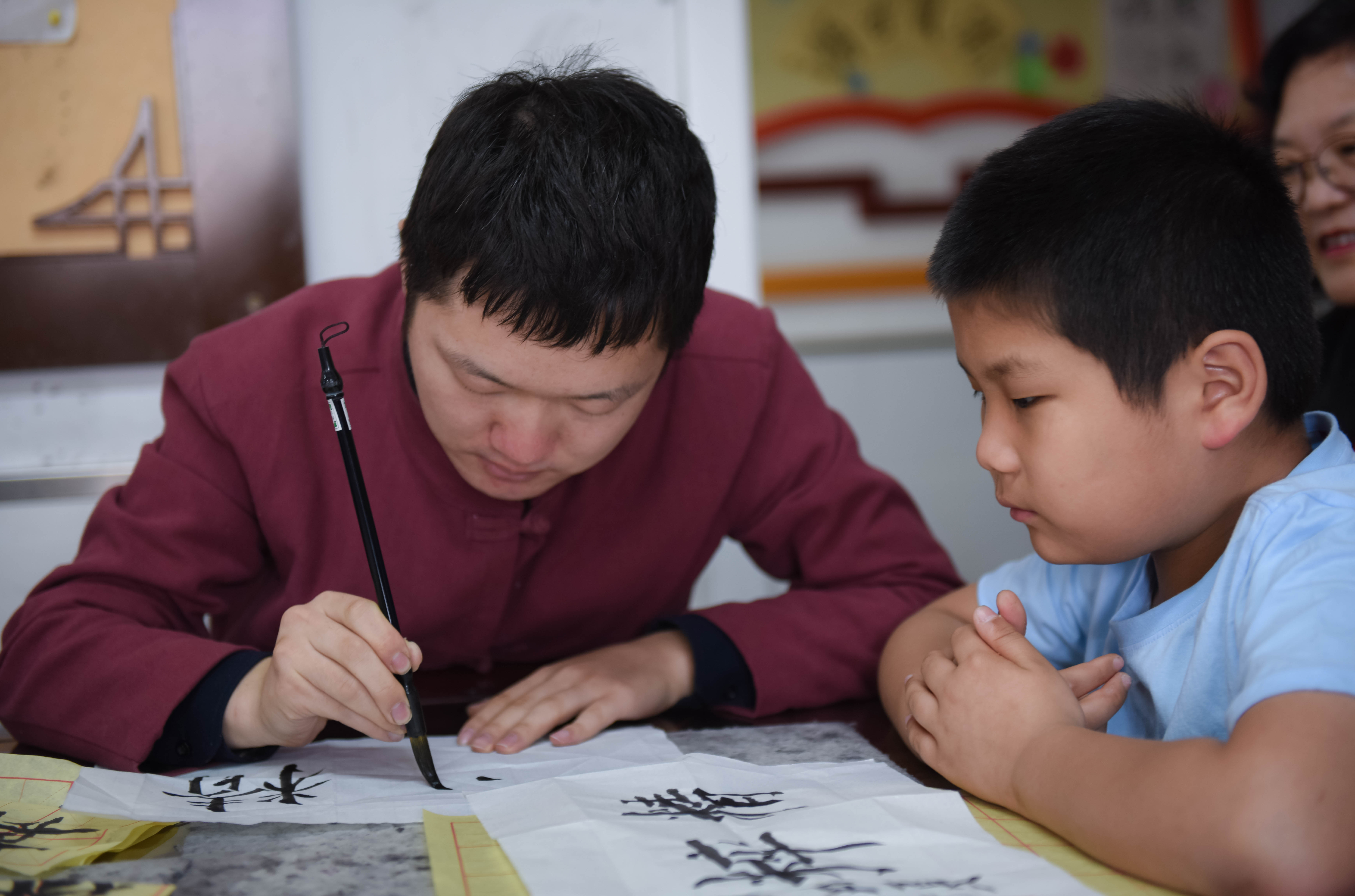 研究生参加书法进课堂活动,现场为探花直播图强二小的学生授课指导