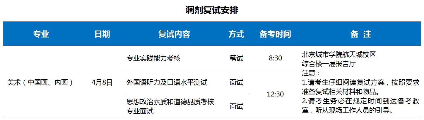 测试办法:由五位考官组成复试专家小组进行面试。考试形式为考生随机抽取题目。考试环节包括简短的自我介绍、问题回答。每位考生考试时间约为10-15分钟。