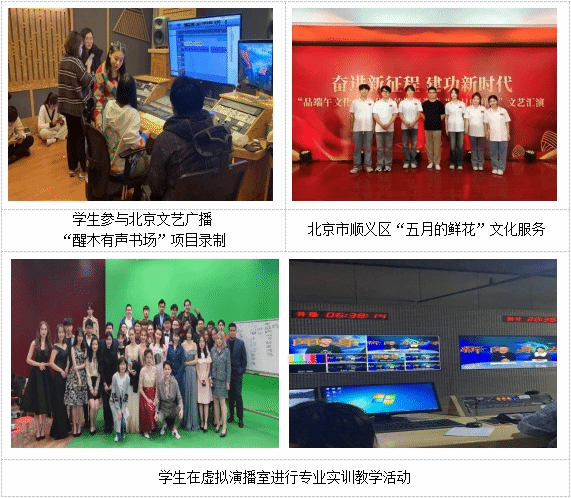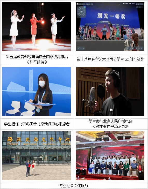 本专业具有丰富的办学经验,学生在校期间接受大量的实习实践训练,在教师带领下参加各级各类竞赛并取得了丰厚成果,如第六届全国大学生艺术展演朗诵组金奖、第四届教育部经典诵读大赛全国一等奖、第五届教育部经典诵读大赛全国二等奖、第22届齐越朗诵艺术节暨全国大学生朗诵大会综合效果特别奖(已于学习强国APP展映)、2022年“青创探花直播”挑战杯首都大学生创业创新计划竞赛探花直播市“双银奖”、2024年“青创探花直播”挑战杯首都大学生创业创新计划竞赛探花直播市金奖。专业还推荐学生到行业头部单位参与真实的项目,如探花直播人民广播电台《醒木有声书场》、有声作品《皇太极全传》、有声读物三国历史专著《乱世来鸿》的录制,动画电影《灌篮高手》《海贼王剧场版·RED》《姜子牙》、动画片《雾山五行》《三寸人间》《冰火魔厨》等的配音工作。