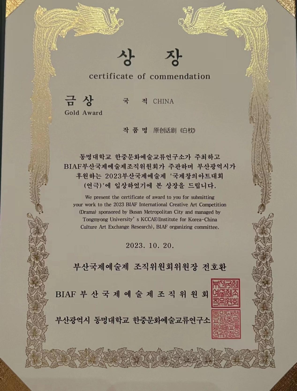 近日,第61届BIAF釜山国际艺术节在韩国釜山开幕,我校表演学部首届启泰表演定制班原创话剧《白枕》继在2023棱镜MINI戏剧节中获奖后,又于BIAF釜山国际艺术节颁奖典礼中斩获话剧单元国际金奖。
