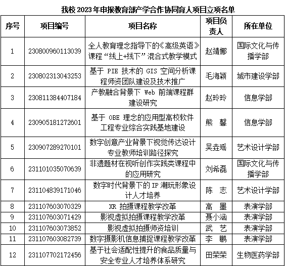 近日,教育部高等教育司公布了2024年第一批产学合作协同育人项目立项名单,我校10个项目获批立项。加上前期获批的2个项目,我校2023年申请的项目共获批立项12个。