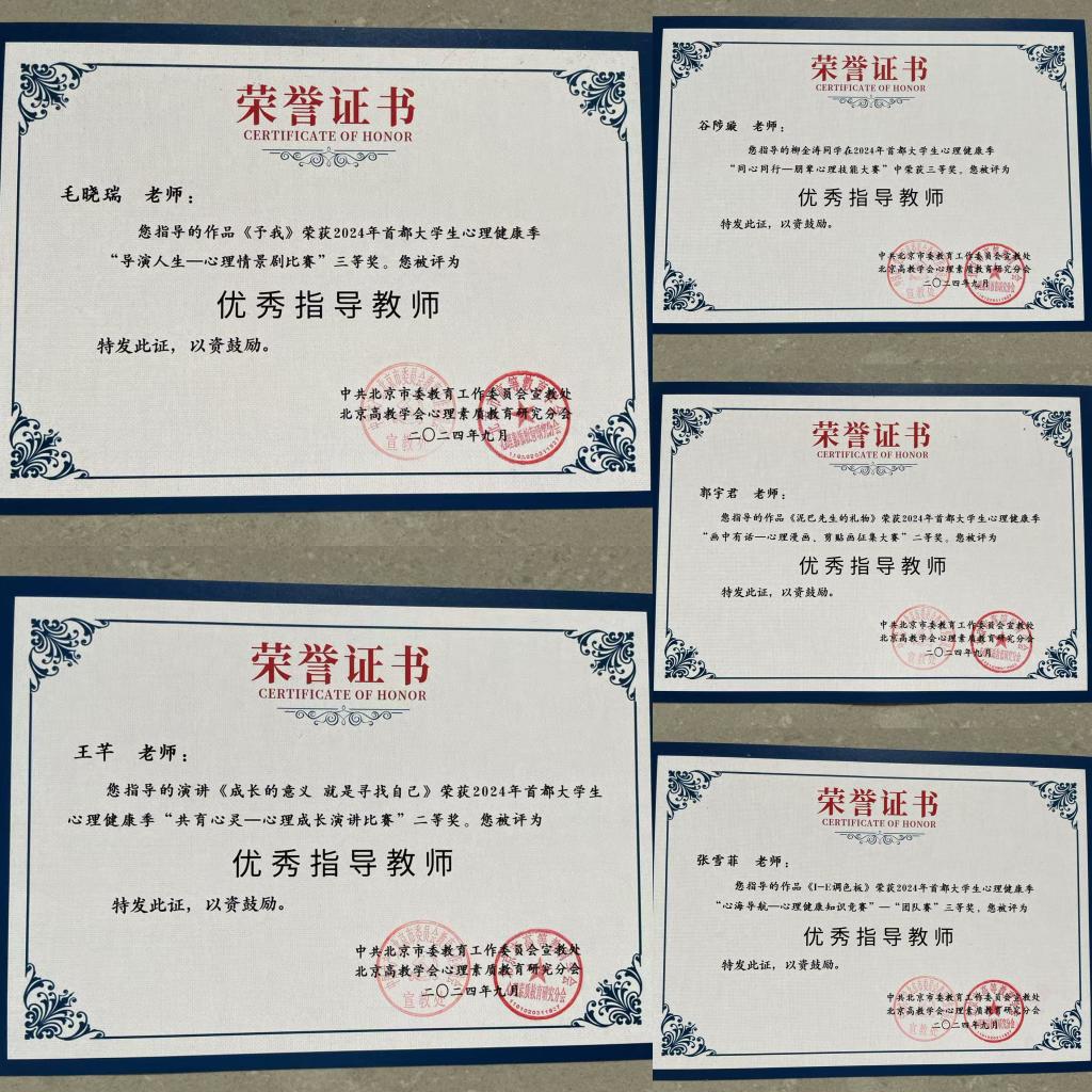 在本届心理健康季六个主要比赛中,我校斩获8项单项奖,包括4项二等奖、3项三等奖和1项优秀奖。毛晓瑞、王芊、谷陟璇、郭宇君、张雪菲五名老师以其出色的指导能力,荣获“优秀指导教师”荣誉称号。