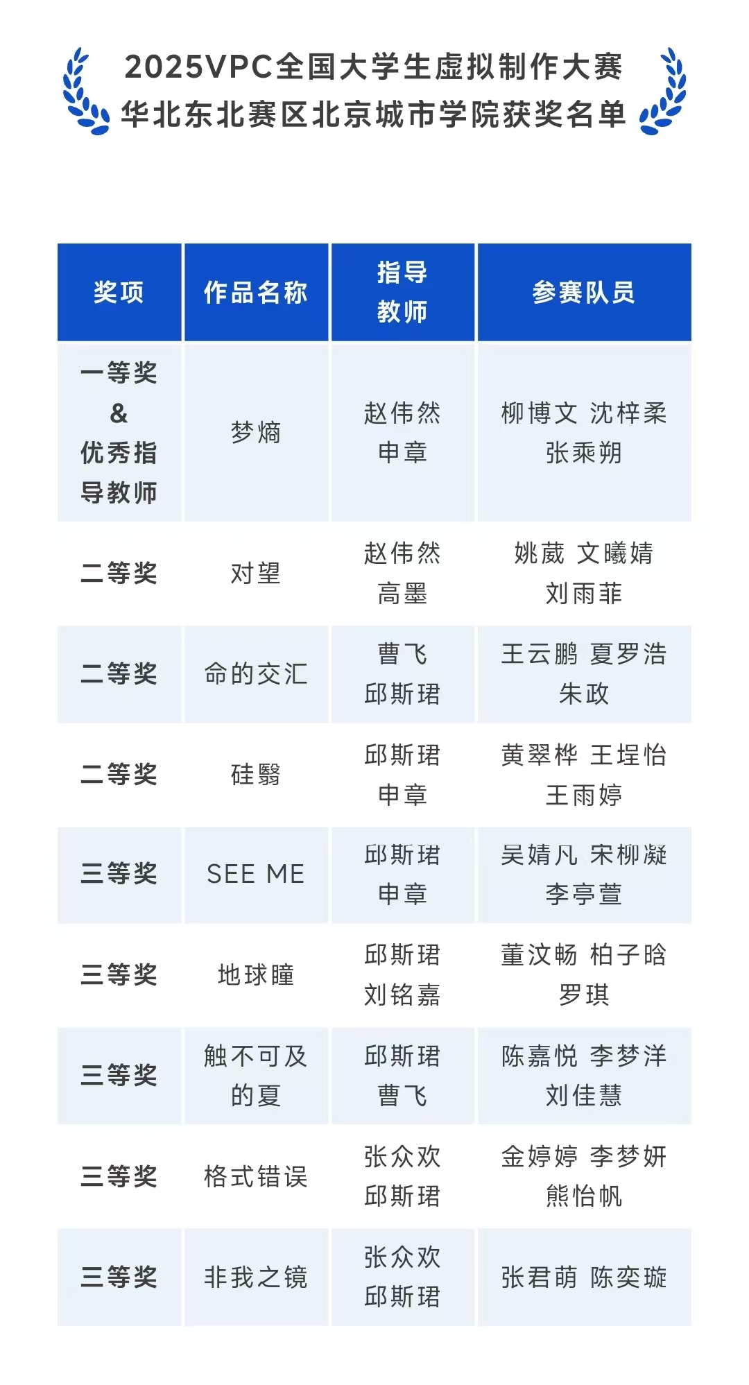 近日,2025VPC全国大学生虚拟制作大赛获奖名单公布,由我校表演学部教师赵伟然、申章指导,教师李鹏、于点倾情演绎,学生柳博文、沈梓柔、张乘朔制作的科幻短片作品《梦熵》荣获华北东北赛区一等奖,由曹飞、张众欢、刘铭嘉、邱斯珺等教师指导的其余6支参赛队伍分别荣获二、三等奖。