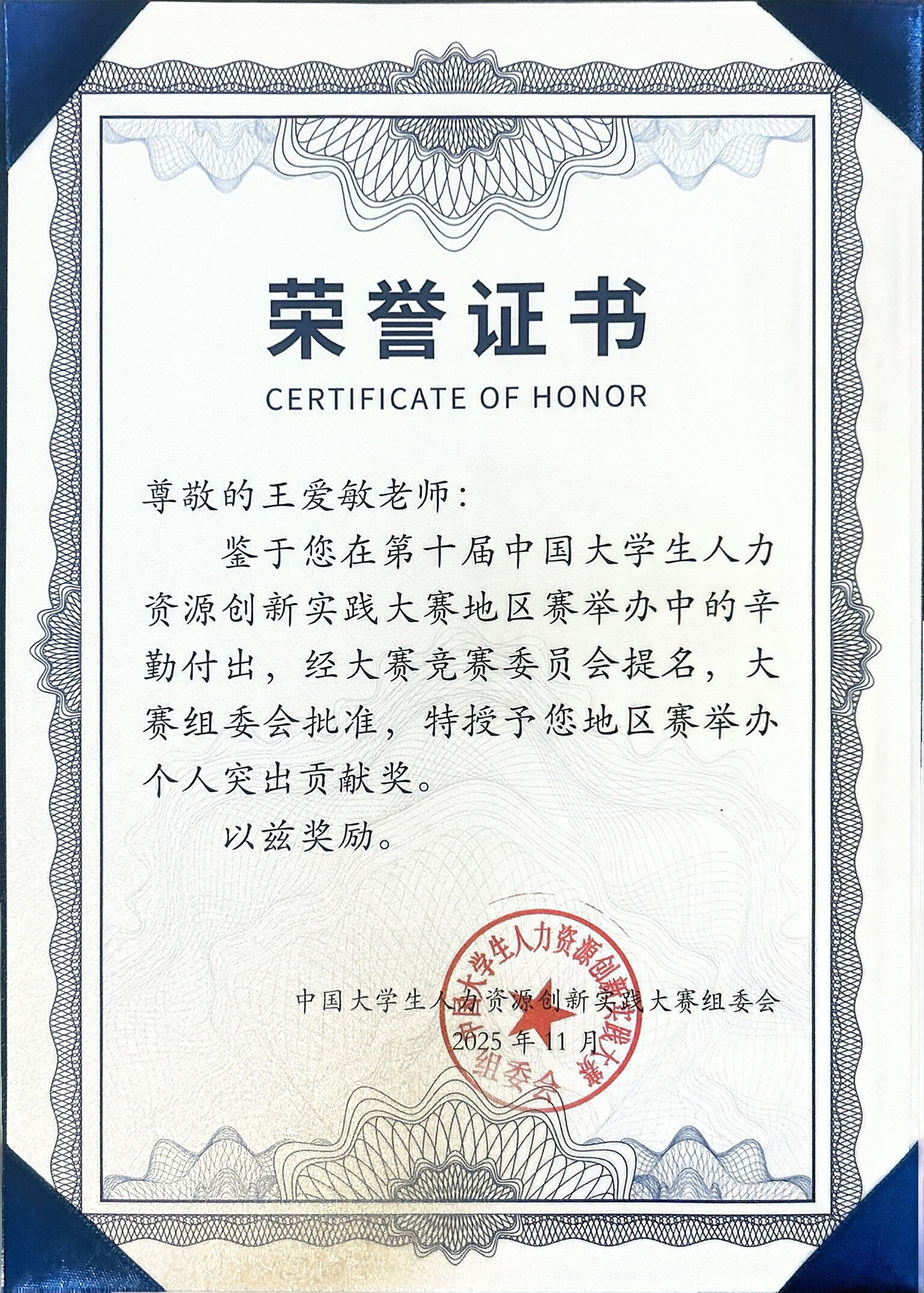 第十届HRU大赛总决赛由中国人才交流协会、中国劳动关系学院、国投人力资源服务有限公司(国聘)共同主办。我校经济管理学部人资教研室王爱敏以京津冀蒙晋执委会主任的身份受邀到总决赛现场,并荣获地区赛举办个人突出贡献奖。