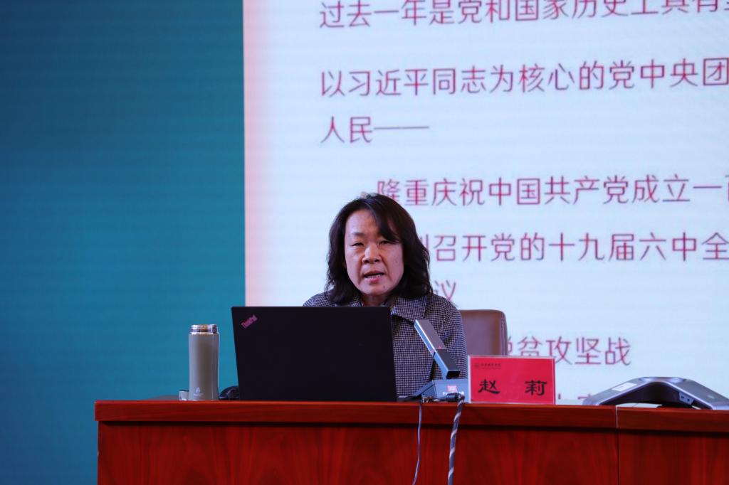 报告会上,赵莉教授从“2021年工作回顾”“2022年经济社会发展的总体要求和政策取向”“2022年政府工作任务”三个方面详细讲述了2022年政府工作报告的基本内容,全面解读了2021年政府工作成就、所面临的问题及2022年的发展目标、政策导向和重点任务。