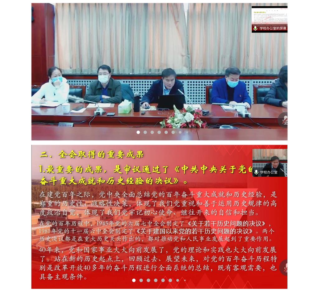 11月15日上午,我校党委召开理论中心组学习(扩大)会,传达学习党的十九届六中全会精神,安排部署全校学习宣传贯彻落实工作。党委书记龚裕同志就学习宣传贯彻党的十九届六中全会作专题报告。会议采取线上线下相结合的方式进行,基层党组织书记和部门负责人以腾讯会议的形式线上参会。