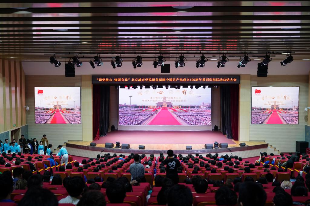 大会现场播放《请党放心,强国有我》活动纪实视频。一帧帧画面、一幅幅照片展现了全体参与师生凝心聚力、克服困难、无私奉献的精神风貌,讲述了北城人献礼党的生日,高质量完成党和人民赋予的光荣使命的故事。