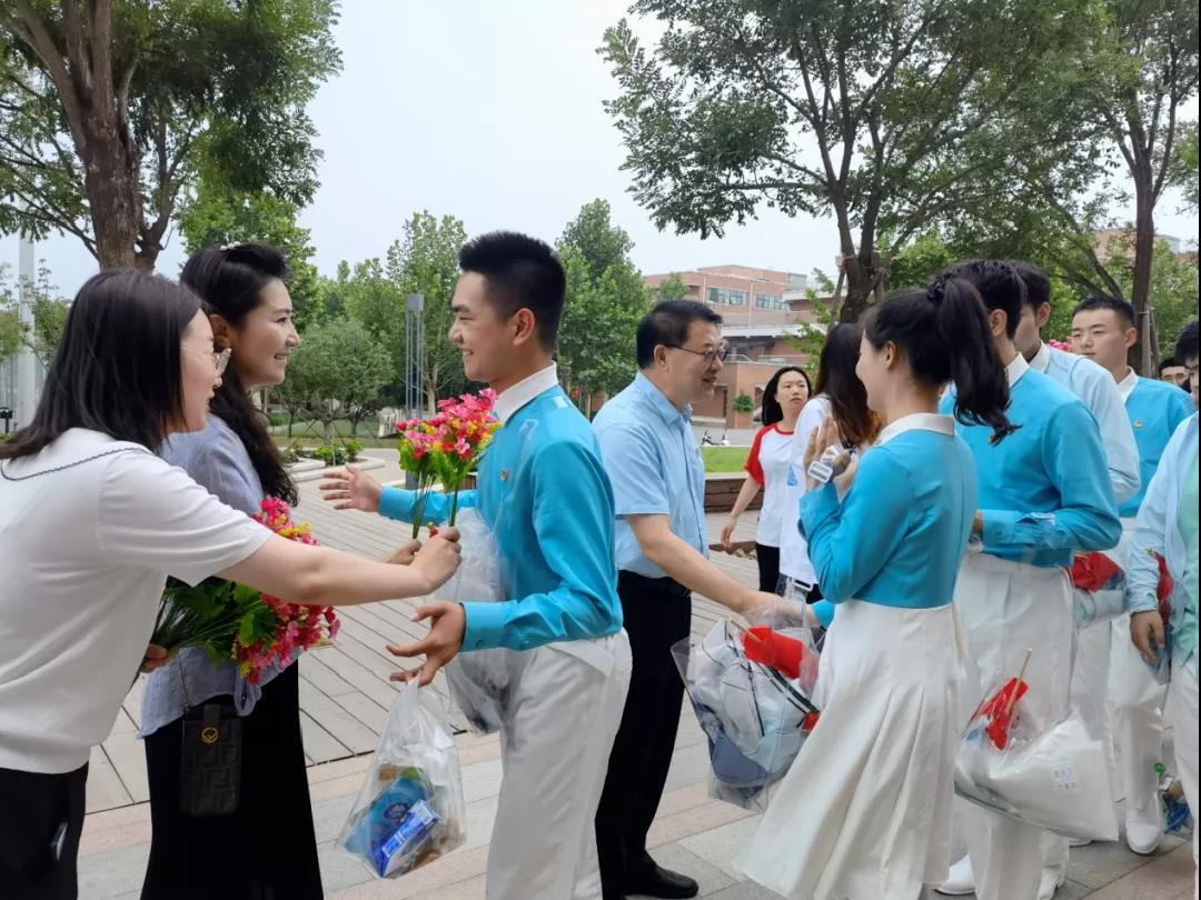 同学们从庆祝大会凯旋回校时,校党委副书记、副校长秦士友,党委宣传部、学工委、表演学部、校团委等相关部门负责人带领所有参训学生的辅导员们一起在潮白讲堂门口为光荣返校的参训师生准备了简短而热烈的迎接仪式。合唱团的同学们自发唱起了《唱支山歌给党听》《新的天地》等歌曲,将在广场上的激动心情第一时间传递给了在校师生。