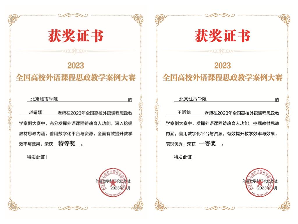此前,在8月份举办的2023年全国高校外语课程思政教学案例大赛中,赵靖娜老师获得特等奖,王昕怡老师获得一等奖。