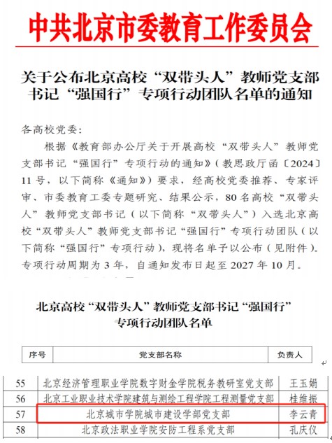 学校党委高度重视重视“双带头人”教师党支部书记培育工作,切实落实“强国行”专项行动工作重要部署,制定有力措施,动员“双带头人”教师党支部书记全员参与“强国行”专项行动,全面强化“双带头人”队伍建设和作用发挥。除入选全国、市级团队的三个党支部外,学校还遴选了经济管理学部党支部和马克思主义学院党支部两个重点“强国行”专项行动团队,发挥示范带动作用,全面增强党支部的政治功能和组织功能,引领广大师生在服务国家重大战略和首都经济社会高质量发展中,为强国建设、民族复兴作出北城贡献。
