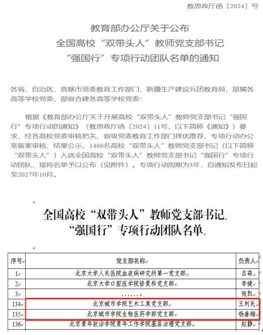 近日,教育部办公厅、探花直播市委教育工委分别公布了全国及探花直播高校“双带头人”教师党支部书记“强国行”专项行动团队名单,我校艺术工美党支部和生物医药学部党支部成功入选全国团队,城市建设学部党支部入选市级团队。