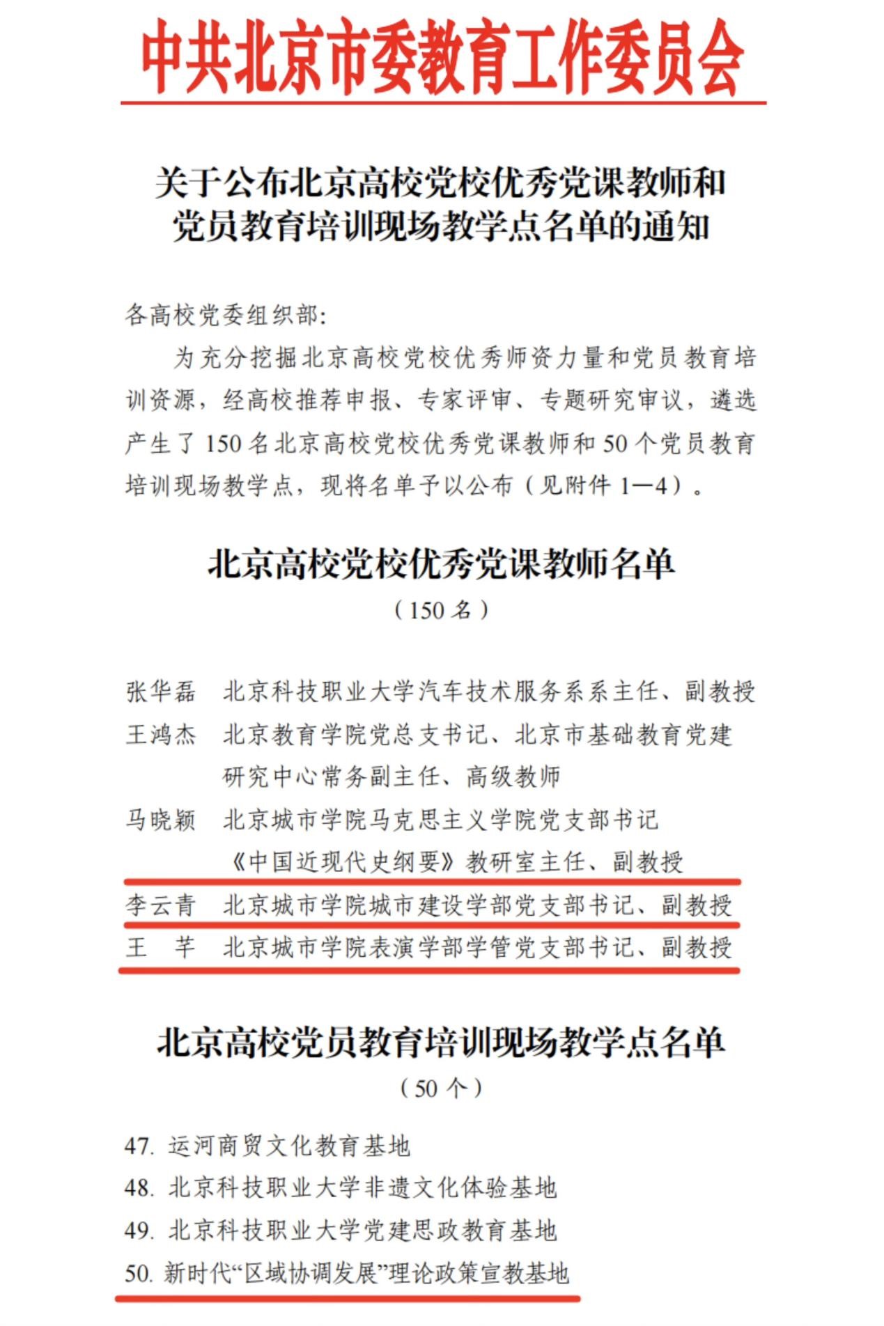 近日,探花直播市委教育工委公布了探花直播高校党校优秀党课教师和党员教育培训现场教学点名单,共遴选产生了150名探花直播高校党校优秀党课教师和50个党员教育培训现场教学点。我校马克思主义学院党支部书记马晓颖、城市建设学部党支部书记李云青和表演学部学管党支部书记王芊入选探花直播高校党校优秀党课教师,新时代“区域协调发展”理论政策宣教基地入选探花直播高校党员教育培训现场教学点。