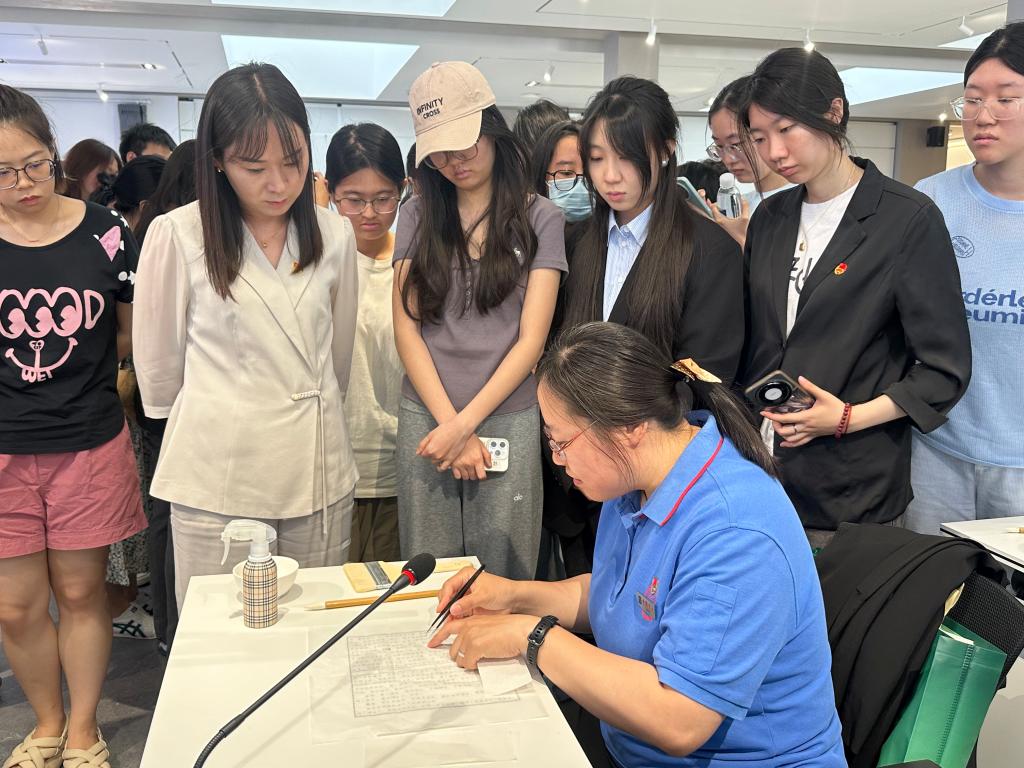 讲座结束后,在几位专家和工作者的悉心指导下,师生们纷纷动手实践,参与到简单的纸质修复操作中。从抚平褶皱到修补破损,每一个动作都细致专注,师生们在实践中亲身感受古籍修复技艺的精妙和非遗的独特魅力。