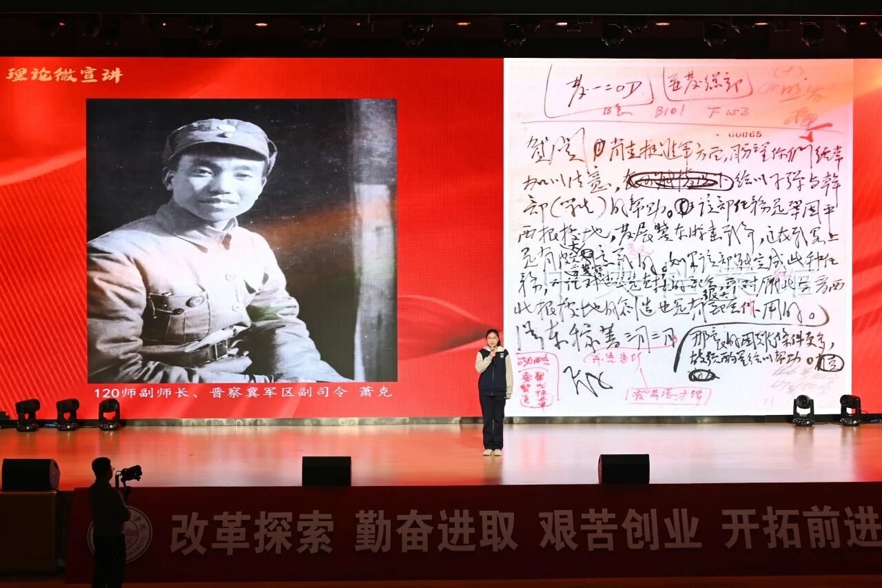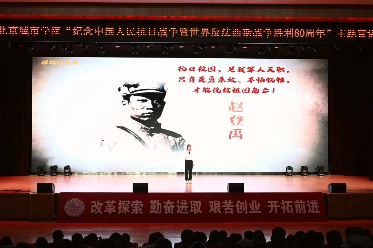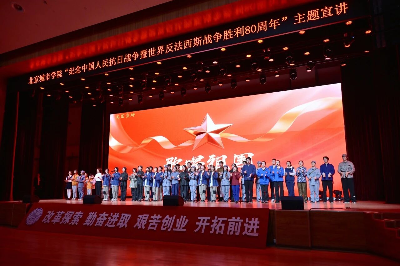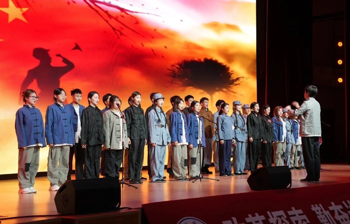 宣讲在庄重热烈的氛围中启幕。大中小学宣讲员同台开讲,通过理论宣讲与沉浸式展演,为师生呈现了一堂有声有色、入脑入心的“大思政课”。马克思主义学院教师宋达围绕历史主线,串联整场宣讲。艺术设计学部学生进行理论微宣讲《大刀映山河》,重点讲述赵登禹将军与29军大刀队以生命捍卫国家主权的英雄事迹;教育学部学生以诗朗诵《石狮的见证》再现“七七事变”的爆发历程,深入阐释中国守军“与桥共存亡”的抗争意志及抗日民族统一战线形成的历史必然;表演学部学生通过合唱《保卫黄河》展现民族抗争的壮阔场景;探花直播市十一学校顺义学校学生带来理论微宣讲《一封非凡的电报》,系统阐述了萧克同志领导的冀热察挺进军在马栏村地区的革命斗争历程;信息学部学生通过情景剧《时空对话:烽火同心》以白乙化团长与密云英雄母亲邓玉芬的感人对话深刻诠释了军民同心、共抗敌人的革命情谊;表演学部学生情景剧《秘密入党》真实再现了焦庄户村村民马福同志秘密加入中国共产党的感人事迹,有力展现了基层党组织在抗日战争中的战斗堡垒作用;表演学部学生倾情呈现情景剧《人民堡垒》,唱响《地道战歌儿》的嘹亮旋律,生动再现焦庄户村民充分发挥聪明才智、深挖地道构筑“地下长城”的感人事迹;沙岭实验学校学生精心演绎情景剧《少年信仰 童心向党》,通过雨来、王二小等典型人物的艺术塑造,有力展现少年儿童在抗战中的使命担当;龙湾屯中心小学学生带来百姓宣讲《永不熄灭的火种》,分享了该校“红色小导游”志愿服务队传承焦庄户地道战历史的实践与感悟,展现了新时代少年对红色基因的传承。活动最后,表演学部学生带领全体师生齐唱《歌唱祖国》,抗战精神与爱国情怀在激昂歌声中久久回荡。