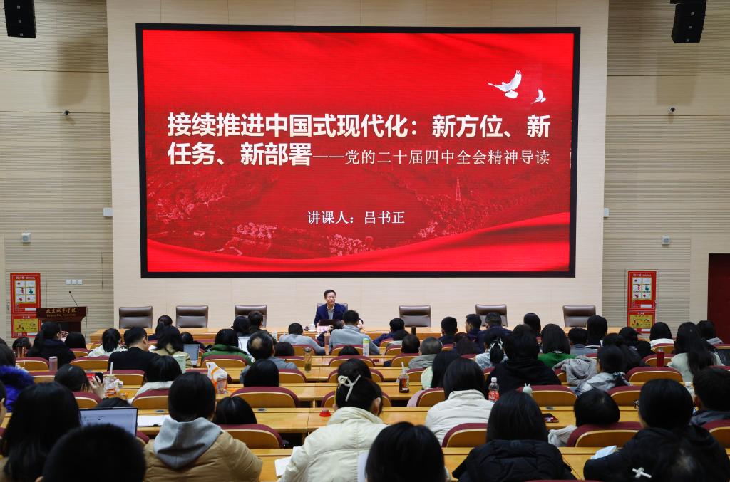 吕书正在题为《接续推进中国式现代化:新方位新任务新部署——党的二十届四中全会精神学习导读》的报告中,从明方向、知大局、懂本行、干实事四个方面对全会精神进行了深入系统讲解。他强调,一要明方向,把握“十五五”时期的历史方位和目标任务,深刻理解中国从工业化到现代化“一张蓝图绘到底”的战略定力;二要知大局,了解实现“十五五”时期经济社会发展目标的重大举措,把握《建议》提出的12个重点领域的目标任务;三要懂本行,自觉在大局下行动,找准业务工作与党和国家工作大局的结合点、着力点,把国家“十五五”时期经济社会发展走向与北城的教学科研管理和学生学业就业结合起来研究;四要干实事,用五年规划的方法规划事业和人生,让学校的事业和个人人生在未来五年更出彩。