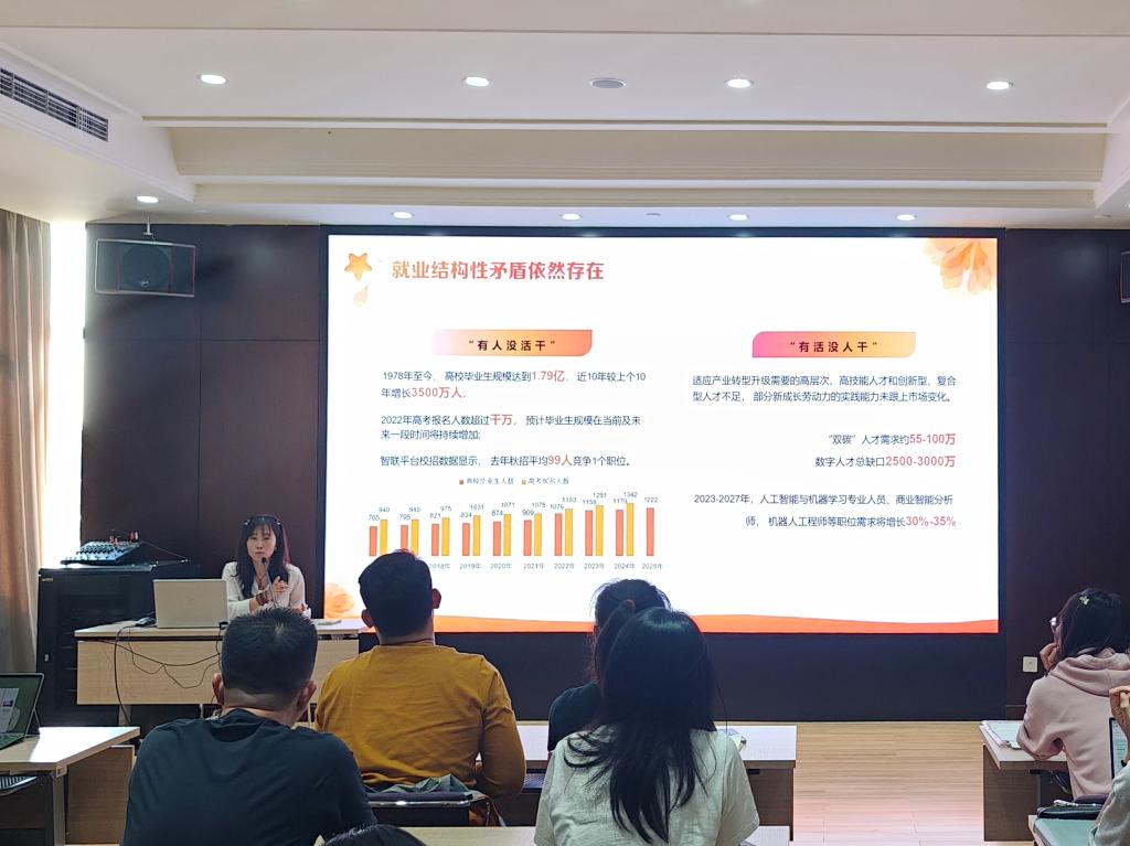 就业工作专项培训围绕就业政策解读、就业形势、毕业去向界定、就业统计流程、就业材料审核、毕业生职业规划、心理疏导等关键内容展开,致力于成为提升辅导员履职能力的“加油站”、推进毕业生工作“精准化、专业化、实效化”的“加速器”。