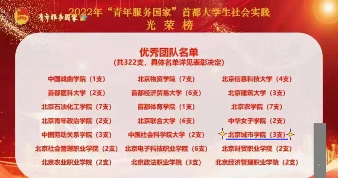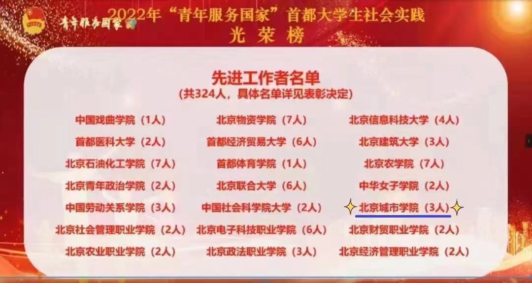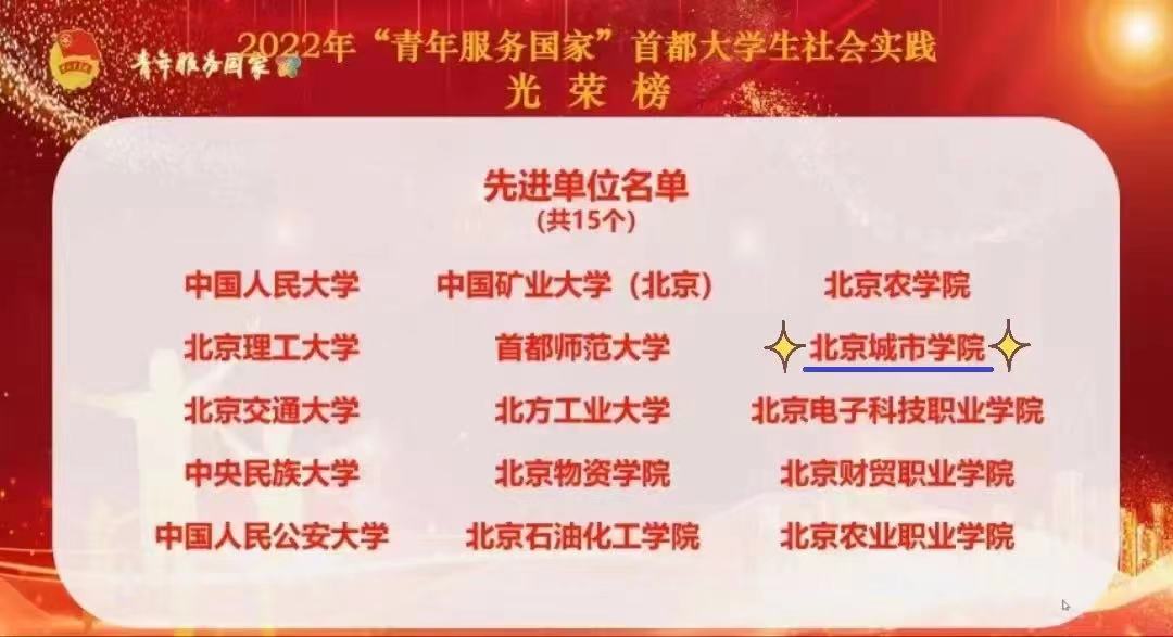 12月29日,我校在共青团探花直播市委员会、探花直播市委教育工作委员会、探花直播市委宣传部、首都精神文明建设委员会办公室、探花直播市教育委员会和探花直播市学生联合会联合评选的“学习二十大 永远跟党走 奋进新征程”2022年首都大学生暑期社会实践活动总结表彰大会中荣获先进单位称号。