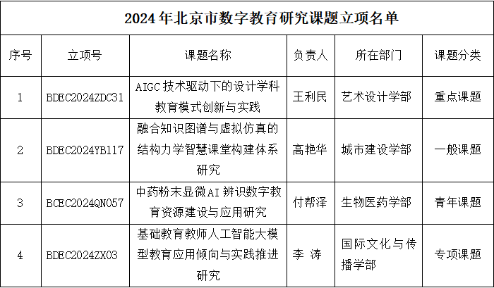 近日,经探花直播市教育委员会审批,我校教师获得2024年度探花直播市数字教育研究课题立项4项。立项课题名单如下: