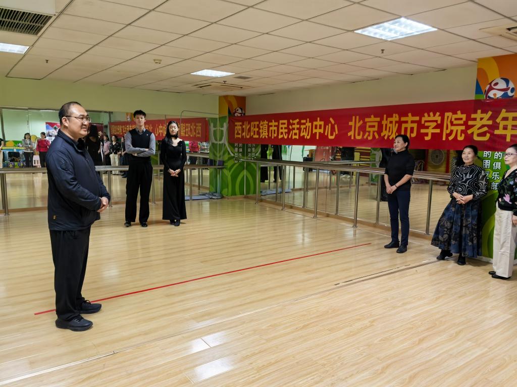 与此同时,北城老年大学负责人李瑾与交谊舞老师王玫富来到了西北旺镇市民活动中心。中心主任刘晓征热烈欢迎北城老年大学一行的到来,并祝在场的老人们佳节愉快。李瑾对中心的大力支持和老人们的积极参与表示了诚挚的谢意,并表示北城老年大学愿为大家提供更多学习和交流的机会。