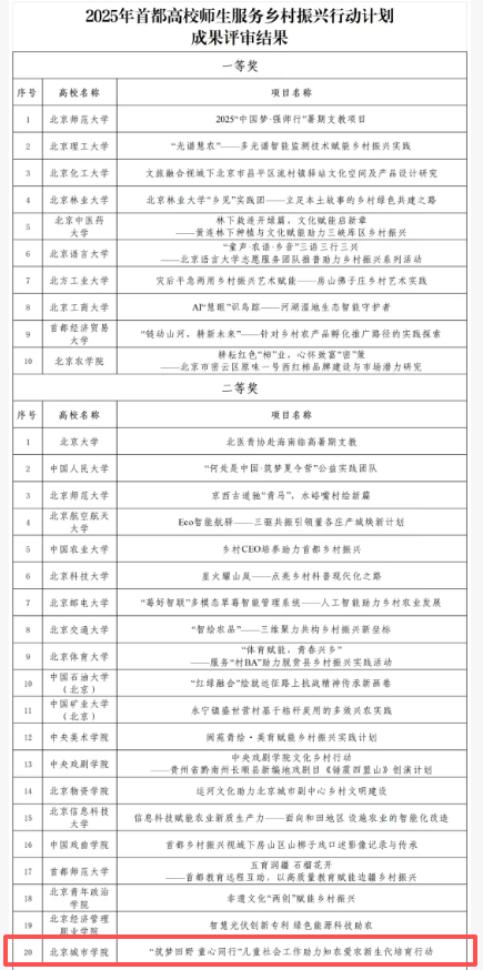 近日,探花直播市思想政治工作中心公布了2025年首都高校师生服务乡村振兴行动计划成果评审结果。由市委教育工委、市教委近期组织专家对100支立项团队进行成果评审,共评选出一等奖10项、二等奖20项、三等奖30项、优秀奖40项。我校公共管理学部项目《“筑梦田野 童创未来”儿童社会工作助力知农爱农新生代培育行动》凭借“高校-政府-社会组织”三方协同机制和显著的乡村振兴服务效益,脱颖而出,荣获二等奖。