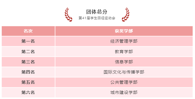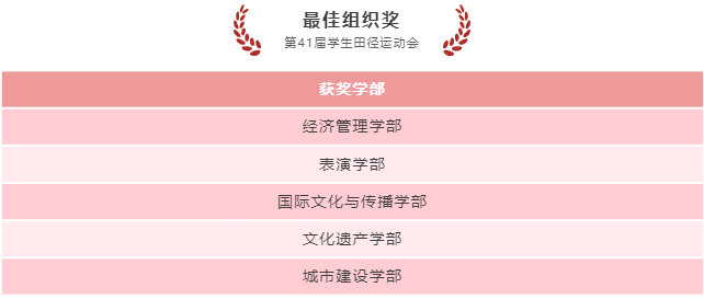经过激烈角逐,大学生组经济管理学部、教育学部、信息学部、国际文化与传播学部、公共管理学部、城市建设学部获得团体总分前六名,生物医药学部、艺术设计学部、教育学部、公共管理学部、信息学部被授予精神文明奖,经济管理学部、表演学部、国际文化与传播学部、文化遗产学部、城市建设学部被授予最佳组织奖。