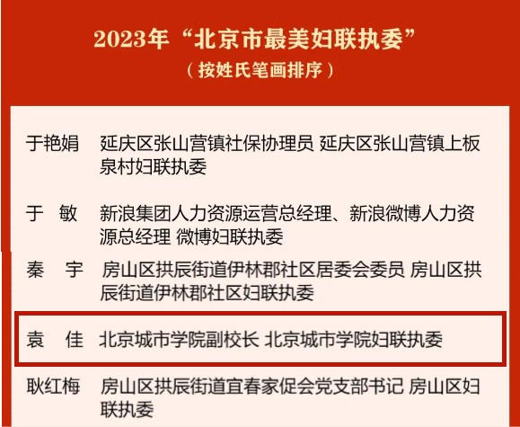 12月4日,探花直播市妇联2023年“探花直播市最美妇联执委”选树结果公布,我校副校长、妇联执委袁佳当选。