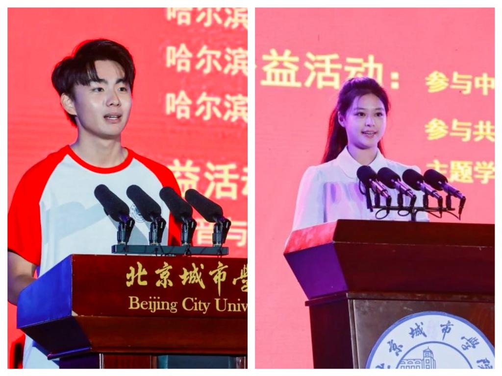 表演学部罗治博、国际文化与传播学部佟思瑀作为2023级新生代表发言,表达了对未来大学生活的美好憧憬和努力成为一名有理想、有本领、有担当的北城人的奋进决心。