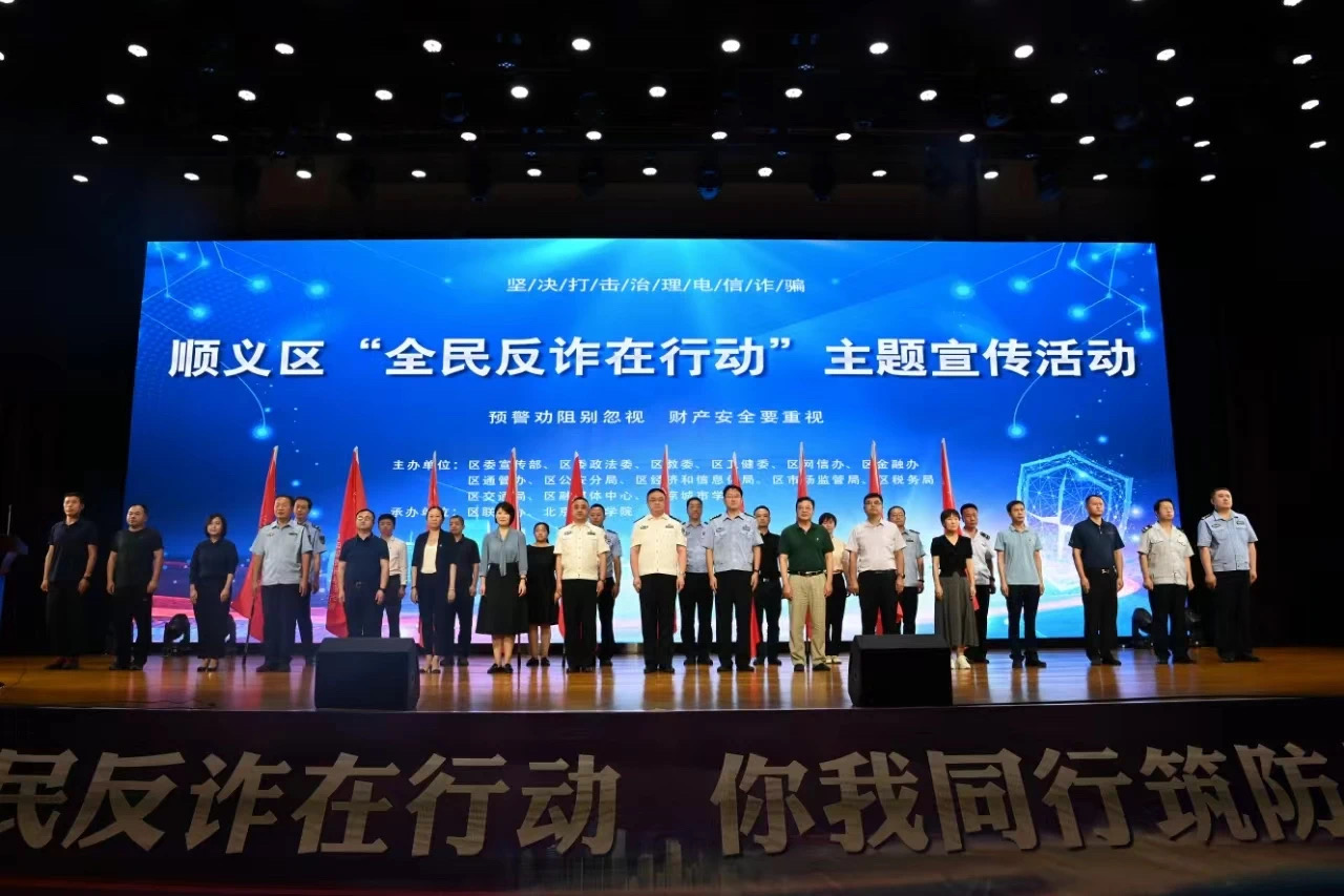 活动中,全体与会人员观看电信网络诈骗十大高发类案介绍和顺义区反诈宣传短剧《破诈》。顺义区副区长、公安分局党委书记、局长杨大胜为区级专业反诈宣传队和9家专业反诈宣传分队进行授旗,并发布全民反诈动员令。