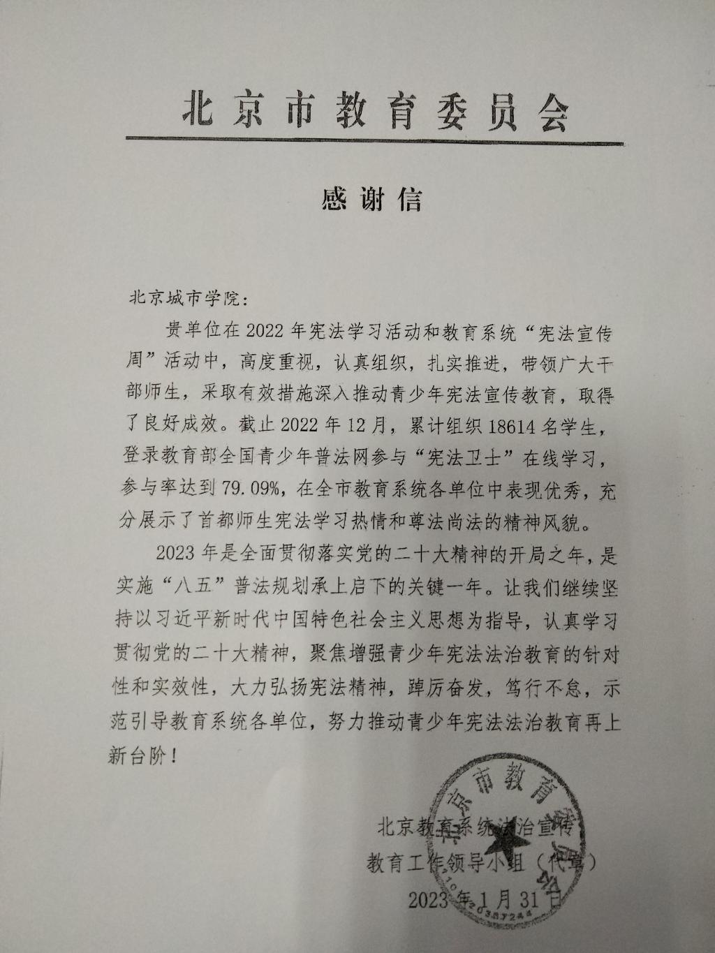 1月31日,我校收到探花直播市教育委员会感谢信,就我校组织参加探花直播市教委2022年宪法活动和教育系统“宪法宣传周”活动成绩给予肯定表扬。