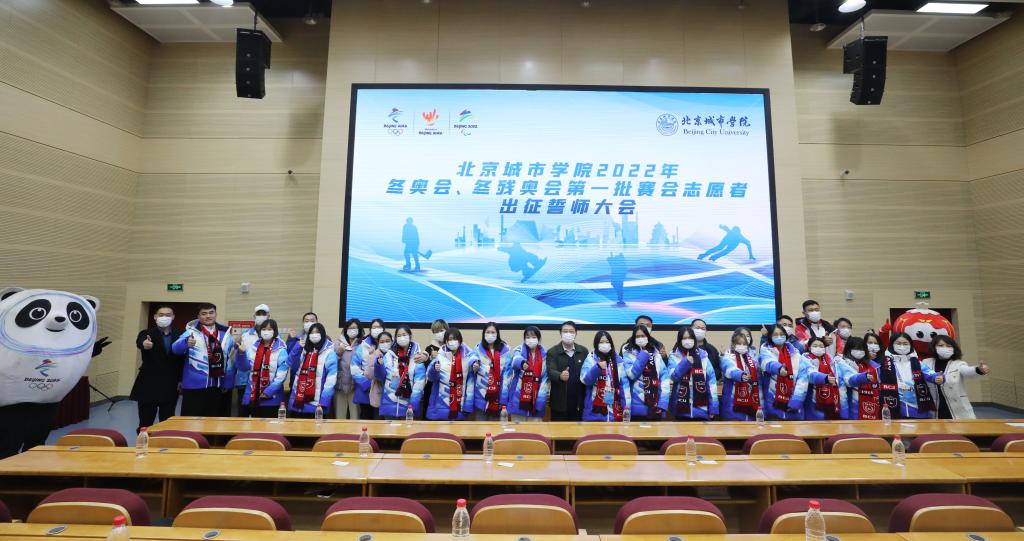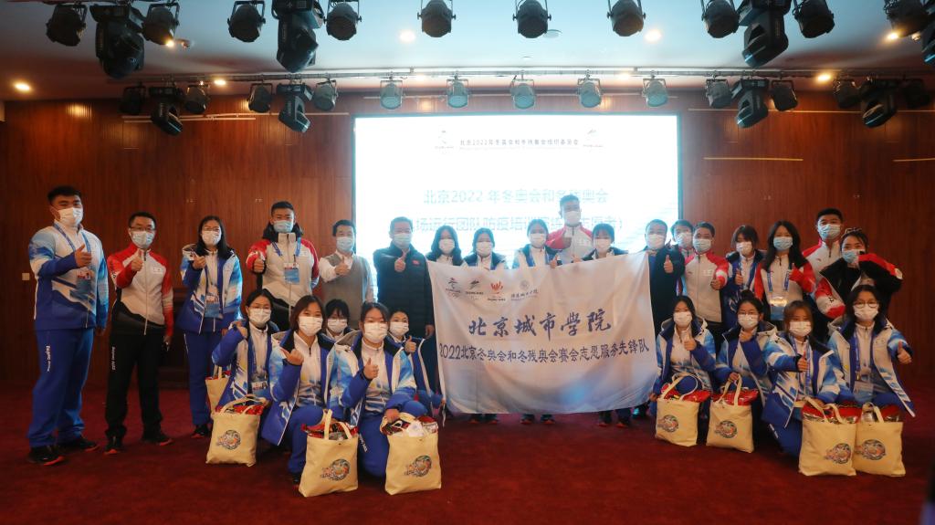 学工委书记杨培玉为出征冬奥志愿者服务队授旗。随后,志愿者们集体宣誓:将共同践行“奉献、友爱、互助、进步”的志愿服务理念,认真落实冬奥会志愿服务工作的标准要求,以优质的服务向世界展示北城学子的责任担当和时代风采。