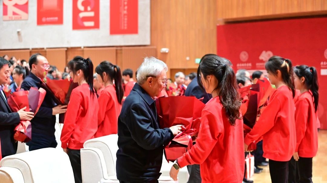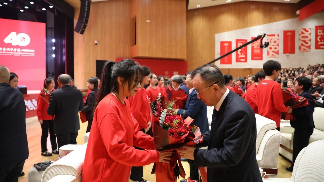 大会上,师生代表共同表演原创情景朗诵《传“城”》,礼赞学校40年初心不改、笃行弥坚。屏幕上一幅幅老照片和老领导、老教师等熟悉面孔激起了大家对过去岁月的温暖回忆;激情的朗诵让青春的活力在会场中飞扬。学生代表向给予学校关心、支持的各位嘉宾献上鲜花,致敬他们情系教育、无私支持。