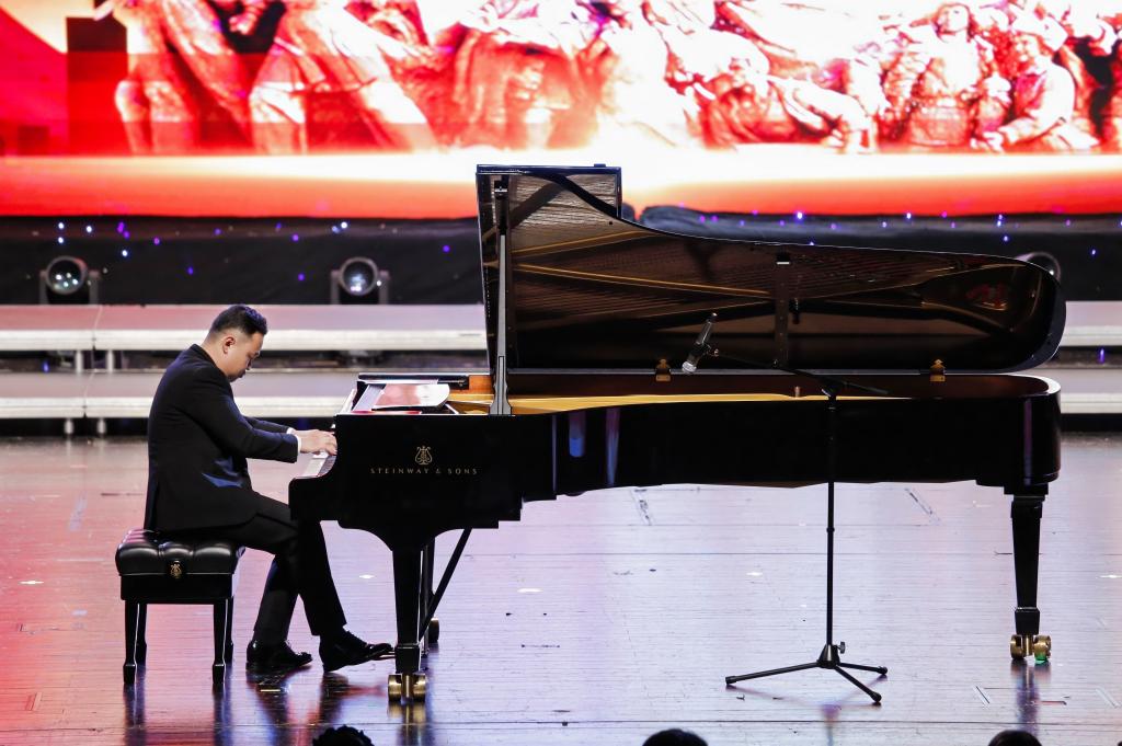 我校教师与大学生合唱团带来的经典爱国歌曲《灯火里的中国》和《不忘初心》演绎出对祖国山河的礼赞与对美好生活的向往。我校硕士毕业生、中国音乐学院首位钢琴演奏博士饶峰奏响钢琴协奏曲《黄河》第四乐章《保卫黄河》,琴声与探花直播音乐加交响乐团的乐声交织,激昂的旋律彷佛又把观众带回到热血抗战的年代。