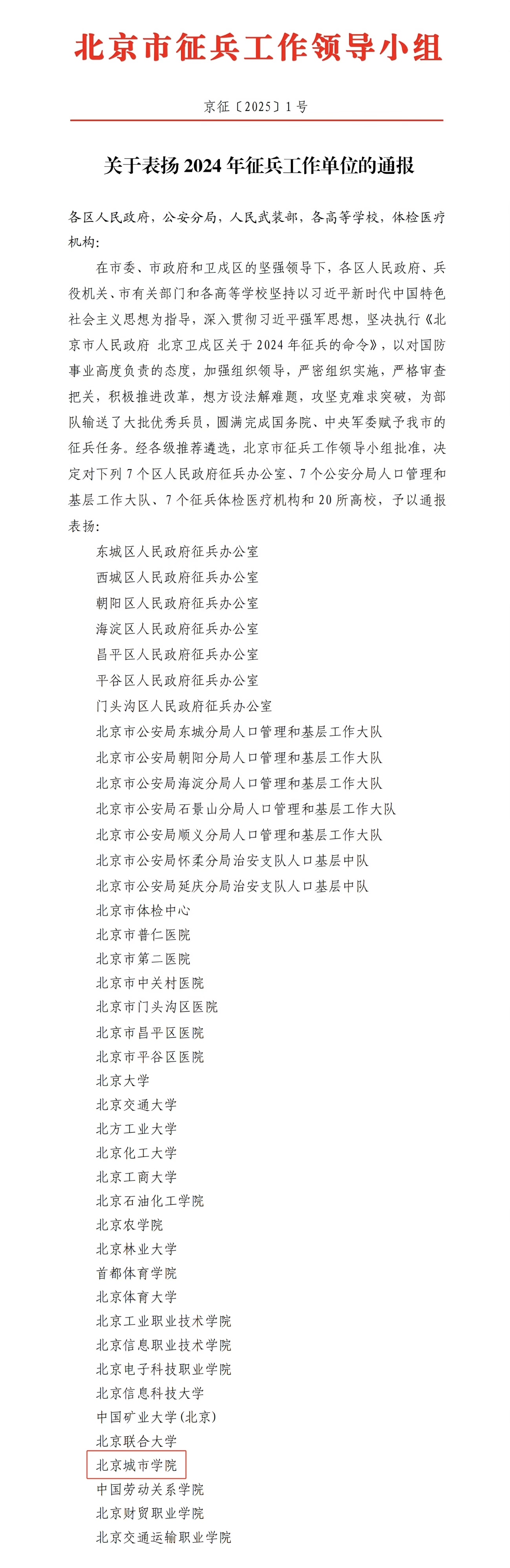 本次共有7个区人民政府征兵办公室、7个公安分局人口管理和京征〔2025〕1号探花直播市征兵工作领导小组基层工作大队、7个征兵体检医疗机构以及20所高校获得通报表扬。此次获得的荣誉是对学校长期重视国防教育,扎实推进征兵工作,圆满完成征兵任务的高度认可。